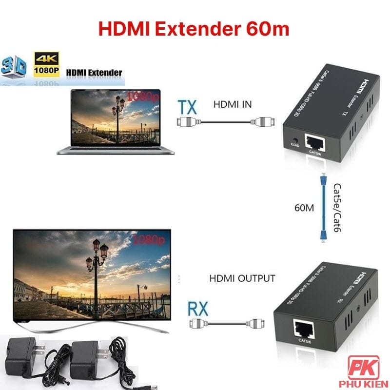 - Bộ kích tín hiệu HDMI qua dây mạng dài 60m sử dụng cáp mạng cat 5, cat 6 lên đến 60 mét thay vì cáp HDMI để truyền tín hiệu độ nét cao, để cắt giảm chi phí. Với khoảng cách truyền dẫn dài mà độ nét cao là rất khó khăn bởi vì dùng cáp HDMI là rất tốn kém và không thường xuyên. Bộ kích tín hiệu HDMI Extender qua dây mạng dài 60m được thiết kế để cung cấp cho truyền dẫn đường dài của tín hiệu độ nét cao.